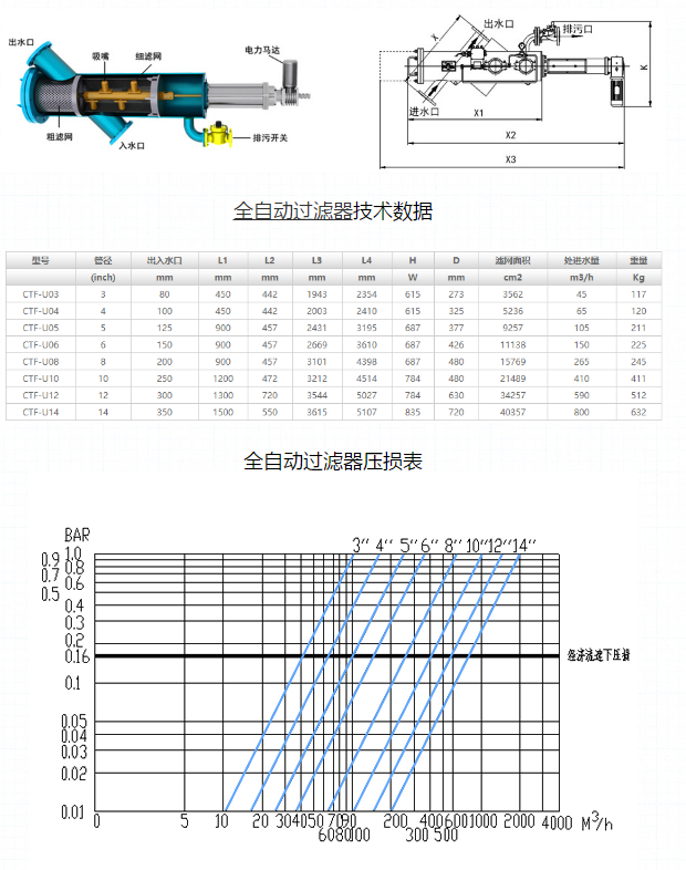 技術(shù)參數(shù) 單臺處理水量: 1040-4160m/h 最大工作壓力: 0.1-1.6Mpa 過濾器清潔時的壓力損失: 0.018Mpa 最高工作水溫: 95℃ 過濾精度范圍: 100-3000m 自清洗所需水量: 1% 自清洗時間: 10-60秒